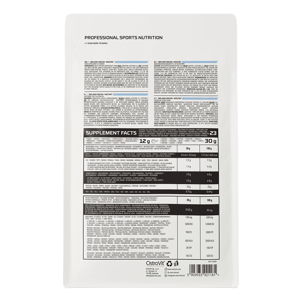 I OstroVit 100% Whey Protein + DigeZyme brukes myseproteinkonsentrat fra melk, som kjennetegnes av god løselighet, høy biotilgjengelighet og rask absorpsjon.